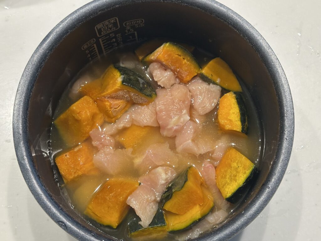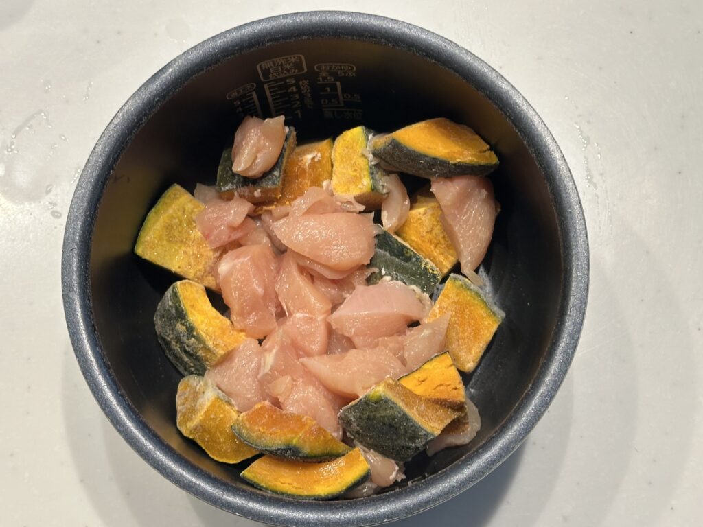 鶏胸肉、冷凍かぼちゃ。食材は以上です。 その時によってお肉を脂身の少ない豚を入れたり、じゃがいもや人参を入れたりもします。