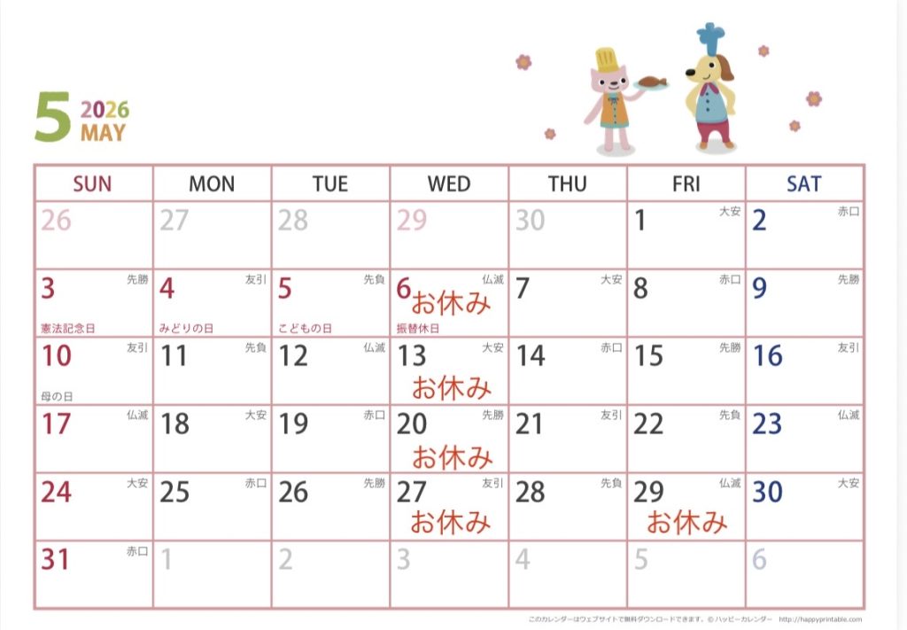 5月は毎週水曜日と29日がお休みになります。